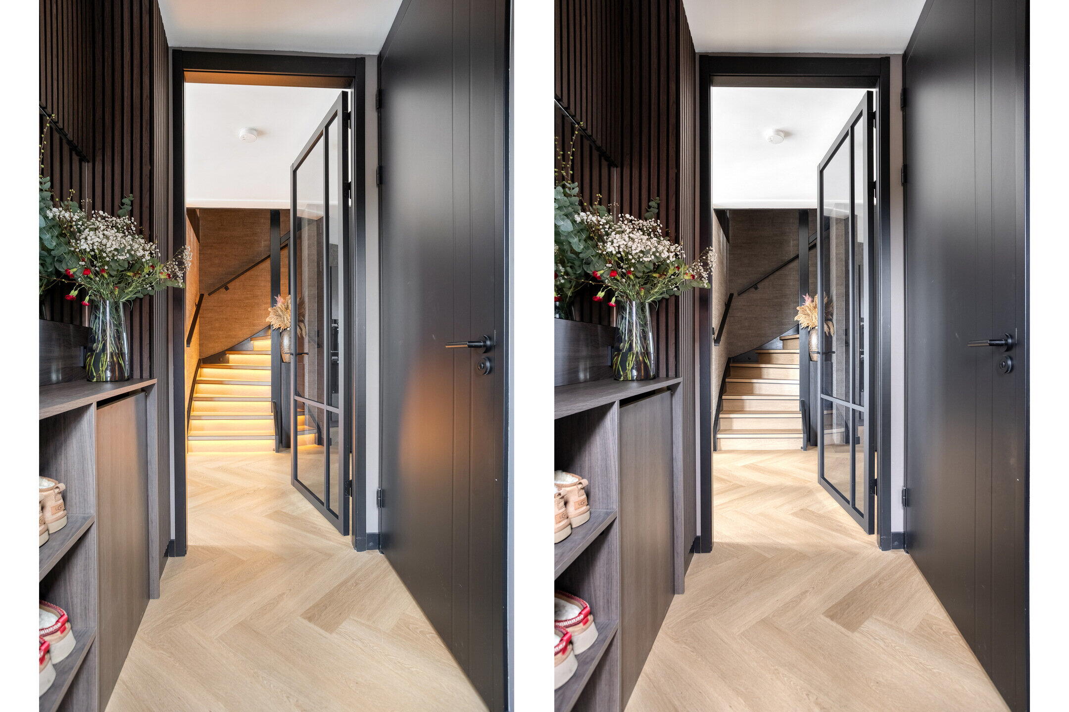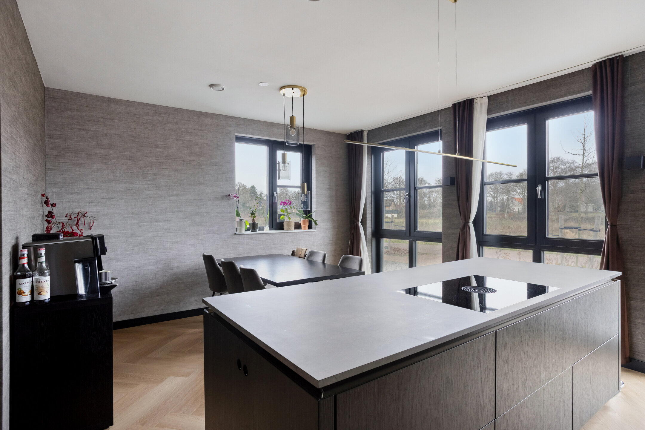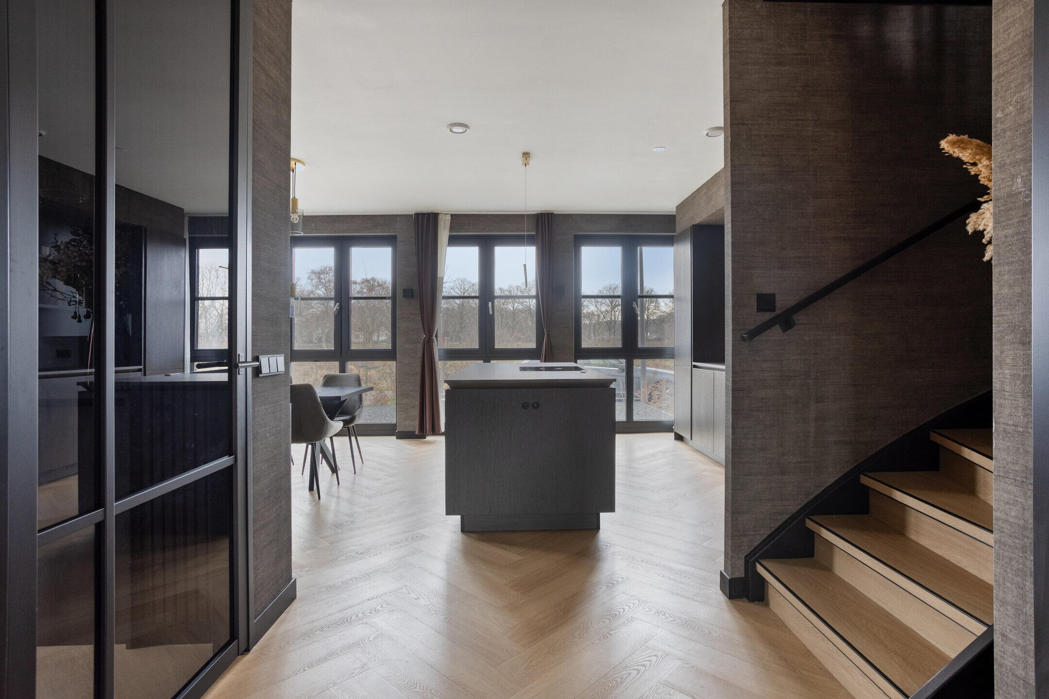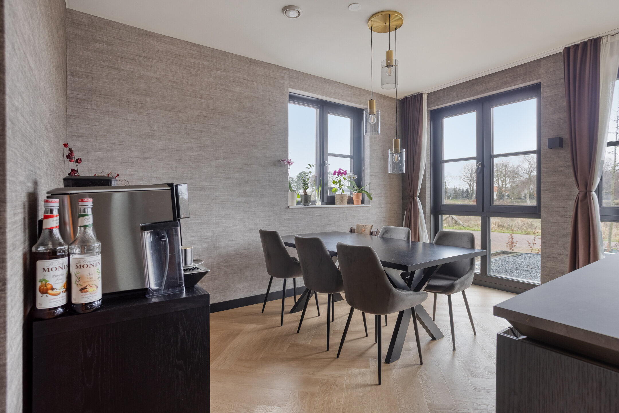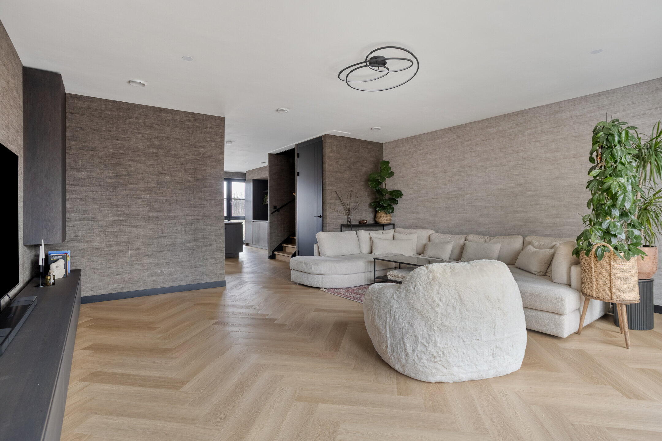 Via de verzorgde voortuin met eigen oprit en carport kom je binnen in de hal en word je meteen verwelkomd door de verzorgde en strak afgewerkte hal. De hal is voorzien van een pvc visgraatvloer, comfortabele vloerverwarming, uitgebreide meterkast, moderne toiletruimte met fontein, garderobe nis en trapopgang naar de 1ste verdieping. De woonkamer is uitgebouwd en voorzien van dezelfde fraaie pvc visgraatvloer, strakke wanden en hoge plafonds. De fraaie woonkeuken is een heerlijke plek om te genieten. De Siematic keuken is voorzien van veel lades en kastruimte, spotjes en uitgerust met moderne inbouwapparatuur, o.a. een inductiekookplaat met geïntegreerde afzuiging, combioven, oven, koelvriescombinatie, vaatwasser en Quooker.